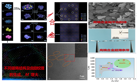 (1) 高磁导率高熵合金新型电子信息材料:设计制备低矫顽力和高磁导率的高熵合金磁性材料,用于电磁兼容、电子信息、磁记录、通信、新能源汽车、磁屏蔽、电磁波吸收等领域。具体从多元素协同及纳米晶微结构可控设计制备新型高磁导率高熵合金粉体或超薄条带,实现磁导率的多频谱有效调控,应用于信息存储和传输、电磁屏蔽、电磁波吸收以及军工隐身等领域。