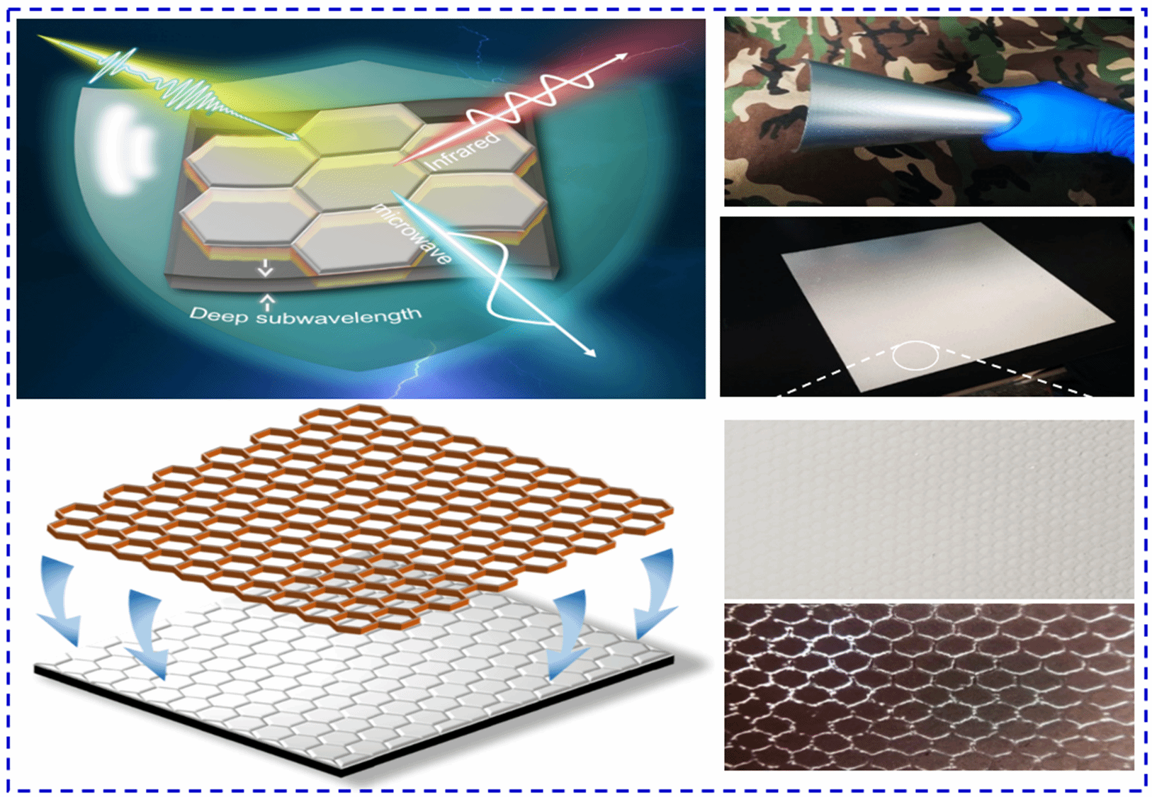 (4) 雷达/红外兼容隐身超构吸波材料:提出“通低频阻高频”仿生超结构,形成“表层红外+底层雷达”复合超结构,实现雷达/红外兼容隐身。红外发射率降低到0.2的同时,底层吸波性能仍保持原有特性,达到国内领先水平。