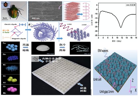 (3) 宽频仿生基元序构吸波材料:根据仿生学原理将高熵合金进行仿生基元多级序构设计,形成高熵合金+多级序构复合材料,有效实现多频段适应性的电磁兼容及吸波和隐身性能。