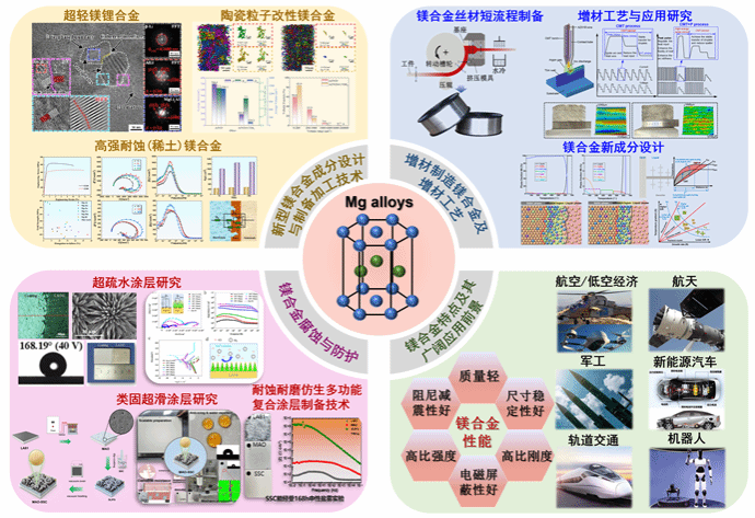 镁合金具有密度小、比强度/比刚度高、导电导热、电磁屏蔽和减震性能好等优点,在航空、航天、军工、新能源汽车、轨道交通、人形机器人、低空经济等领域的应用前景广阔,但需突破强塑性协同提升、多功能集成、腐蚀防护、短流程制备等难题。本团队面向国家和各行业装备轻量化的重大需求,长期致力于镁合金新材料成分设计与优化、材料改性、成形成性制备与加工技术的研发,助推镁合金从“潜力材料”向“主流材料”的转型与应用。