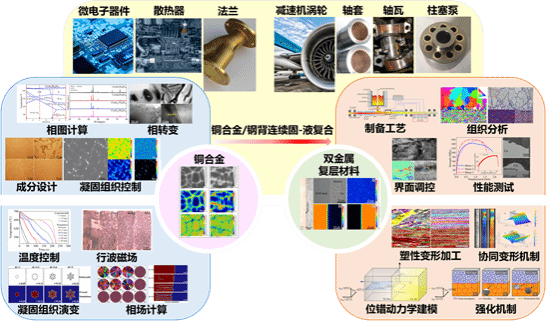 (1) 新型铜合金材料设计及凝固过程数字化控制:开发高强高导铜基合金(如铜铬锆、铜镍硅体系)、高强高弹铜合金工程化制备(铜镍锡等水平、垂直连铸)、高强耐磨黄铜设计与制备等;磁场、流场、温度场多物理场耦合凝固过程数字化控制。
