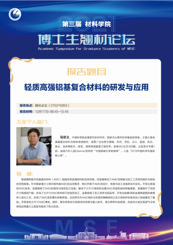 本次论坛中,马宗义与卢磊两位特邀嘉宾分别作专题报告。马宗义老师主要向我们讲述了轻质高强铝基复合材料的研发与应用。他所在的团队通过独特的创新思想以及科研手段解决了我国面临的瓶颈问题,并取得了重大突破,其成果广泛应用于“嫦娥、天问、天和、北斗”等重要领域。