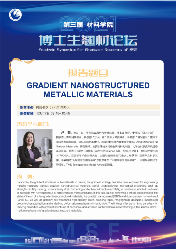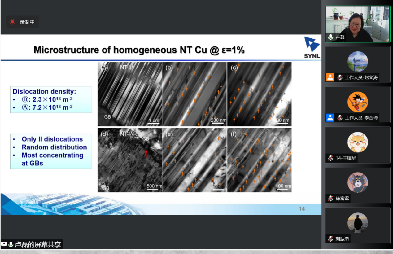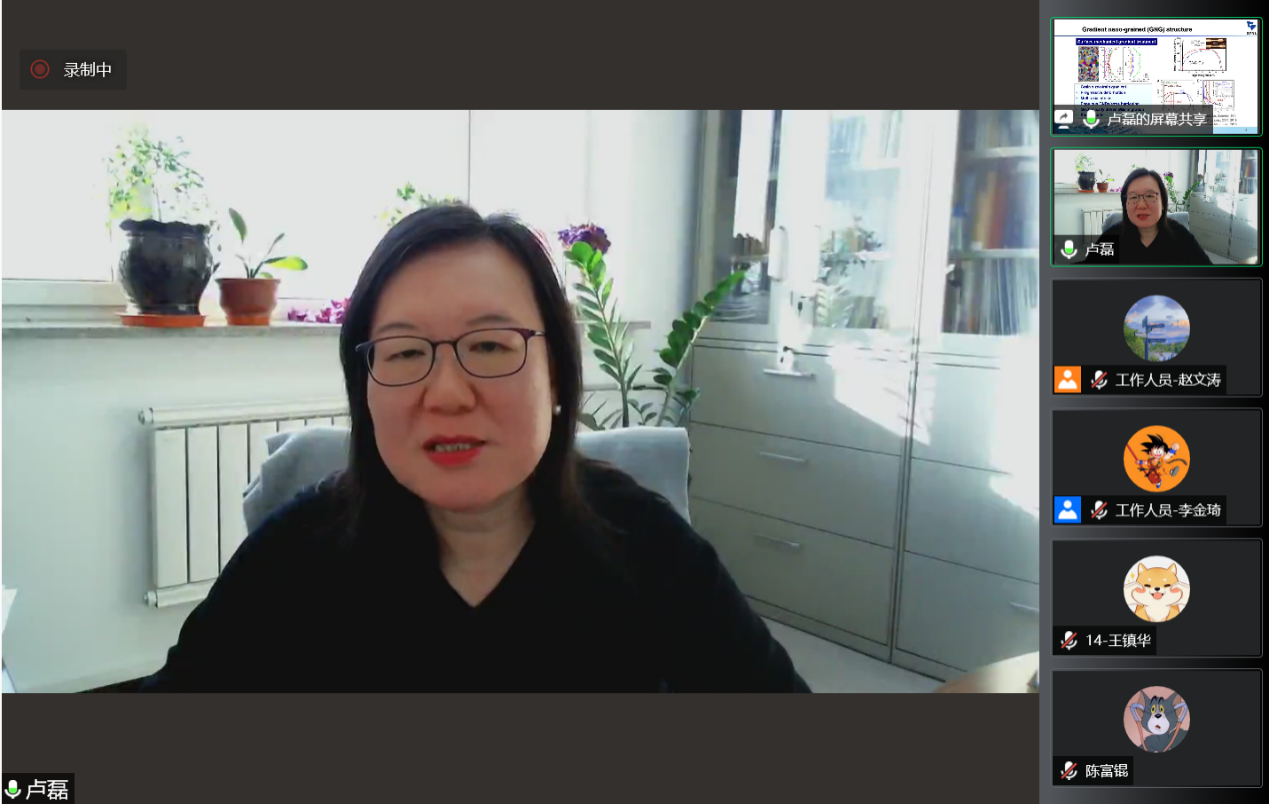 接下来,卢磊老师以《GRADIENT NANOSTRUCTURED METALLIC MATERIALS》为题做了报告,针对纳米材料制备、变形机理等方面做了详细的阐述。她所在团队提出的双重梯度纳米结构,为纳米级材料的发展做出重大贡献。随后,卢磊老师针对赵杰教授提出的关于纳米孪晶材料力学性能的问题,以及郭恩宇教授提出的关于不同区域晶粒长大机制的问题,做了详细解答,这为相关课题的研究提供了新思路。