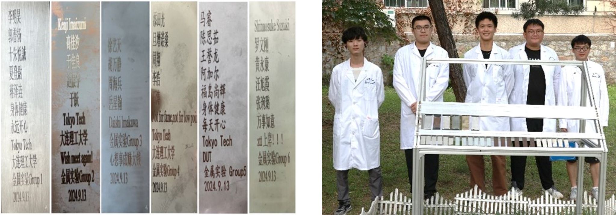 实验结束后,每组组员将名字及心愿刻在了经不同处理后的304不锈钢板上,并一起将其放置在大气自然环境暴露台架上,这不仅为长周期自然环境腐蚀研究提供支撑,同时也给同学们留下了美好的回忆。