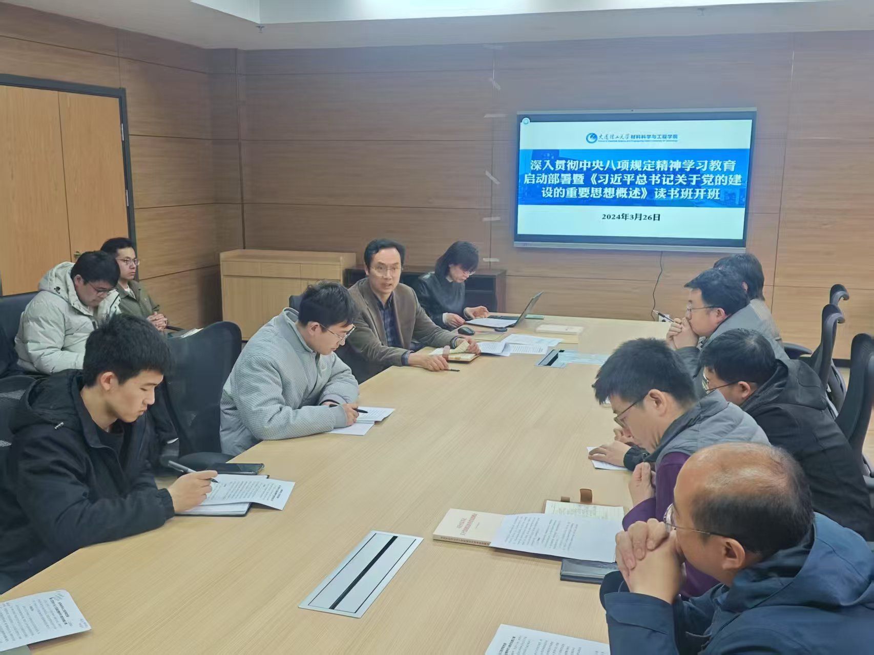 3月26日,材料科学与工程学院召开深入贯彻中央八项规定精神动员部署会暨《习近平总书记关于党的建设的重要思想概述》读书班开班。学院领导班子成员、院长助理、党委委员、各党支部书记参加会议。