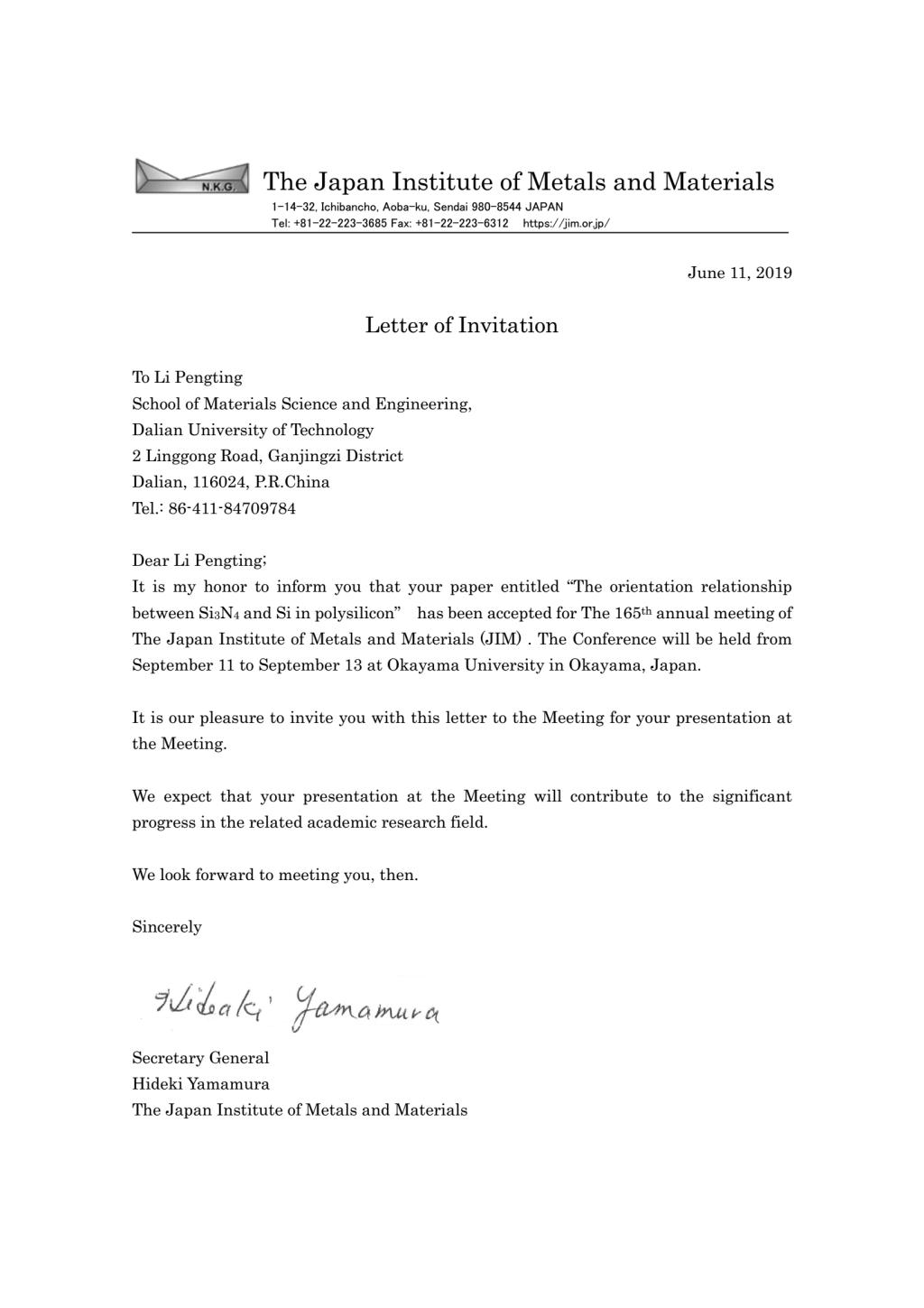 应日本金属学会(The Japan Institute of Metals and Materials)Hideki Yamamura邀请,我单位李鹏廷拟赴日本进行学术交流。现将该团组拟出访情况公示如下: