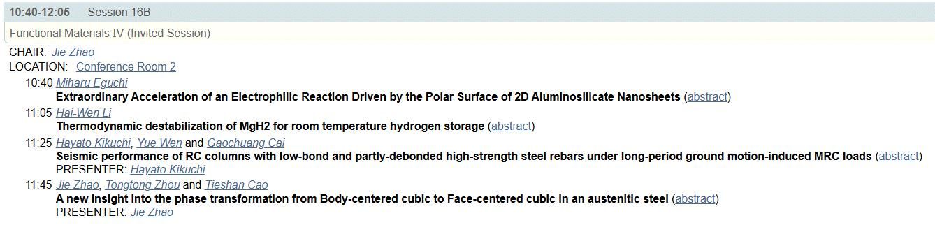 赵杰教授在会议上做了“A new insight into the phase transformation from Body-centered cubic to Face-centered cubic in an austenitic steel”报告,旨在报道在工程材料构件中发现的新的相变形式,为该领域的研究者提供了新的视野。赵杰教授同时担任了 “Functional Materials Ⅳ”分会场主席,主持分会报告,推荐了最佳青年学者报告。