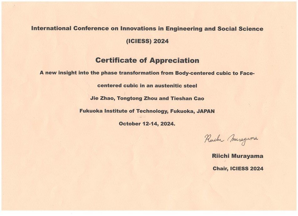 2024年10月12日至10月15日,材料学院赵杰教授受邀赴日本福冈参加了International Conference on Innovations in Engineering and Social Science (ICIESS2024)会议。