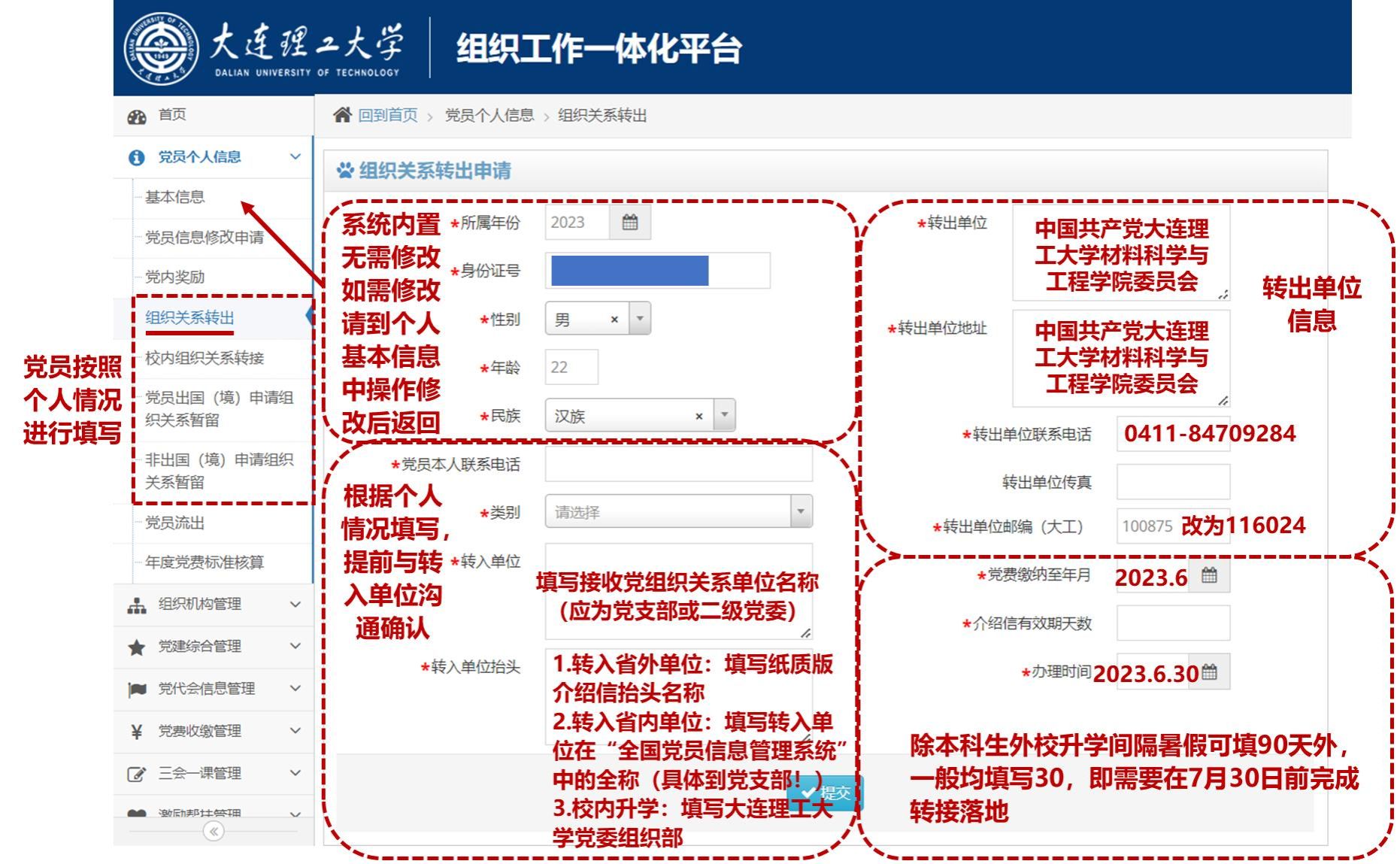 经支部批准后,党员本人需登录大连理工大学组织工作一体化平台(https://zzgz.dlut.edu.cn)提交组织关系转出申请(统一身份认证账号登录,“党员个人信息”-“组织关系转出”,详见下图),请提前与转入单位沟通确认无误。