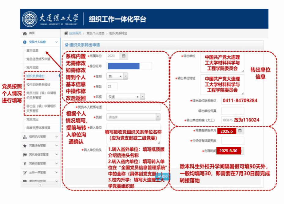 特别说明:在组工一体化平台上,①凡是毕业生党员,应做到组织关系应转尽转,申请组织关系转出。②本校升学(含硕士、博士)无需填写组工一体化平台,党委办公室将根据腾讯在线表格直接进行新学号升级。③出国学生可申请党员出国(境)申请组织关系保留,登录学院党委网站下载出国组织关系保留承诺书(http://mse.dlut.edu.cn/dwgz/xzzq.htm),也可将组织关系转接回家庭居住地;④国内暂时无法进行转接选择非出国(境)申请组织关系保留,登录学院党委网站下载毕业生党员保留党组织关系承诺书(http://mse.dlut.edu.cn/dwgz/xzzq.htm)。首次申请保留时间为6个月,自6月30日计算。