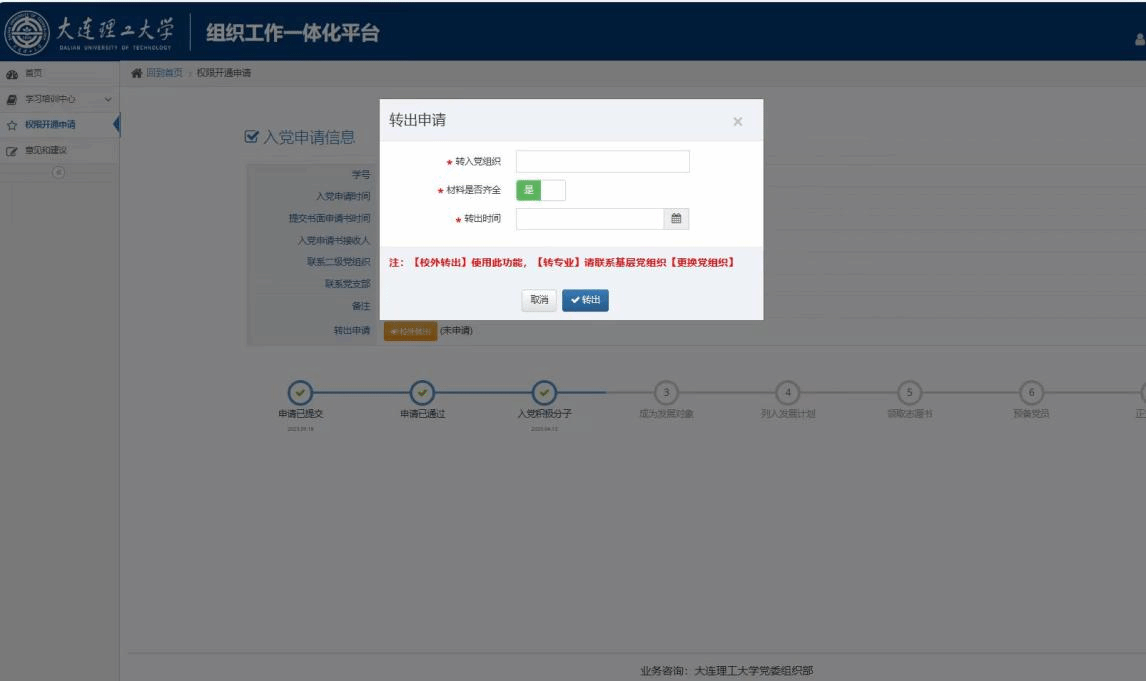②登录学校组工一体化平台https://zzgz.dlut.edu.cn提交转出申请(“党员个人信息”-“组织关系转出”)。如图所示: