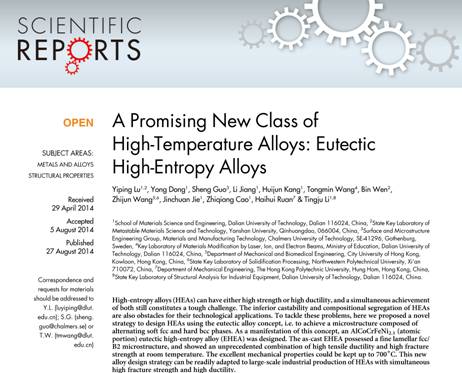 近日,大连理工大学材料科学与工程学院李廷举教授研究团队在Nature子刊Scientific Reports上发表以“A Promising New Class of High-Temperature Alloys: Eutectic High-Entropy Alloys”为题的论文。该论文提出了“共晶高熵”这一全新的合金设计思想,第一作者是卢一平副教授,通信作者是王同敏教授和瑞典查尔姆斯理工大学的郭晟博士,博士生董勇和蒋丽协助完成了本文的合金制备实验及力学性能测试。文章链接为: