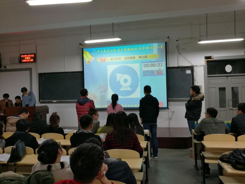决赛于11月10日18时在材料馆201正式开始,6个代表队按照赛前抽签顺序依次答题。决赛由必答题、竞技题、识图题和风险题4个环节组成,在前两个环节,各支队伍答题正确率都很高,比分始终未拉开较大差距。第三环节识图题每组给出7个实验室常见图标,要求在60s内说出其含义,各队正确数量均在5个以上,更有一队全部答对,赢得了在场观众的阵阵掌声。在风险题环节,各队的差距开始显现出来,比分逐渐拉开,材料中心实验室于凤云老师的点评也让参赛选手和在场观众对实验安全知识有了进一步的认识。