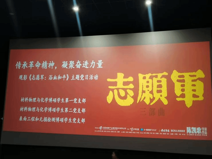 为深入推进党史学习教育常态化长效化,大力弘扬伟大的抗美援朝精神,进一步激发支部成员的爱国情怀与奋斗热情,锻造优良学风,材料学院材料物理与化学博硕学生第一党支部、材料物理与化学博硕学生第二党支部、表面工程和无损检测博硕学生党支部于2025年10月11日联合开展观影《志愿军:浴血和平》主题党日活动,全体党员及入党积极分子共同参加此次党性教育活动。