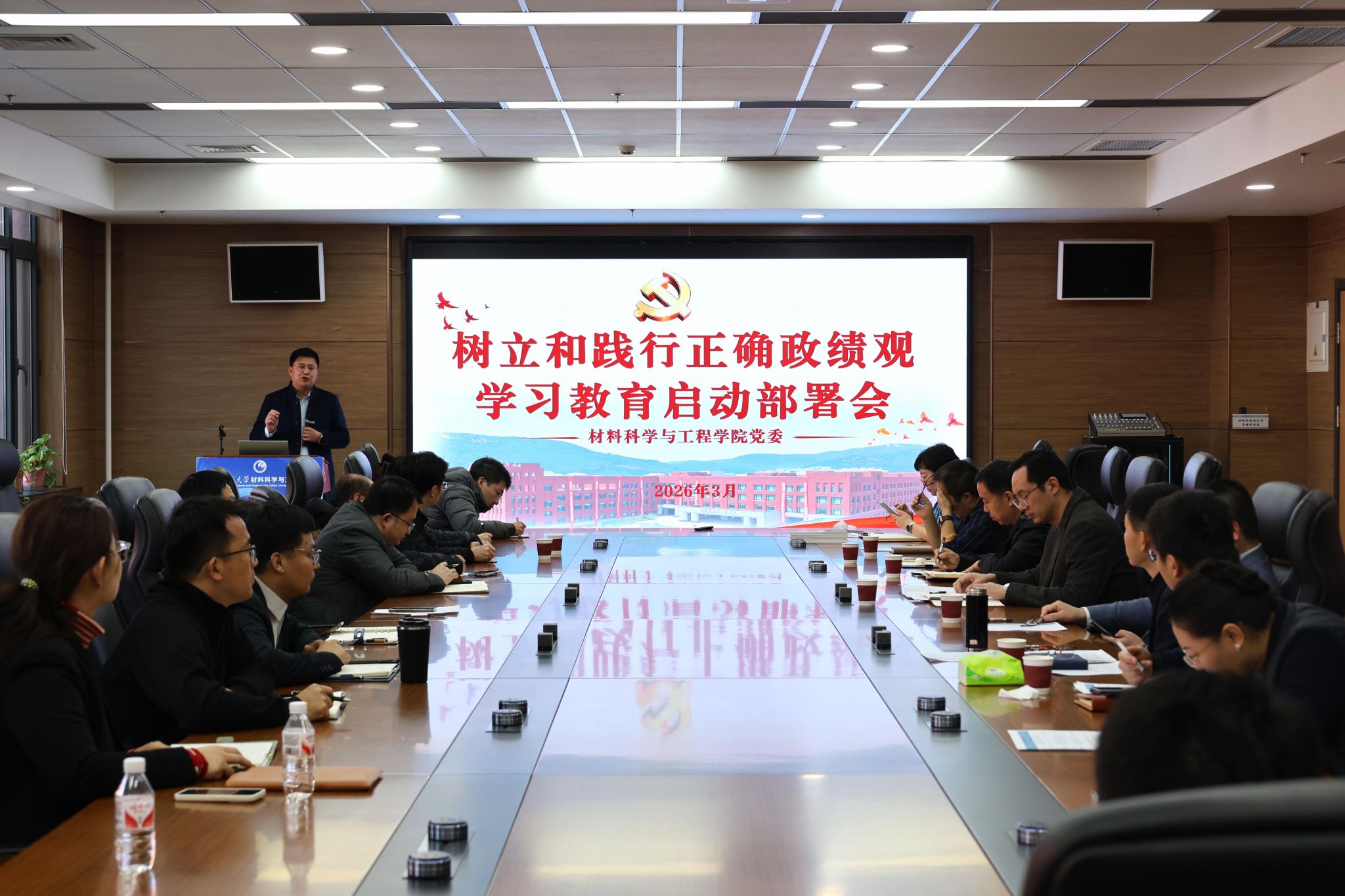 2026年3月6日下午,材料科学与工程学院在知远楼A304召开党委(扩大)会议,专题部署在全院开展树立和践行正确政绩观学习教育。学院领导班子成员、党委委员、系主任、专业负责人、院长助理、七级管理岗干部及各党支部书记参加了会议。学院党委书记董红刚主持会议并作动员部署讲话,学院党委副书记兼副院长李长利就学习教育具体任务安排作说明。